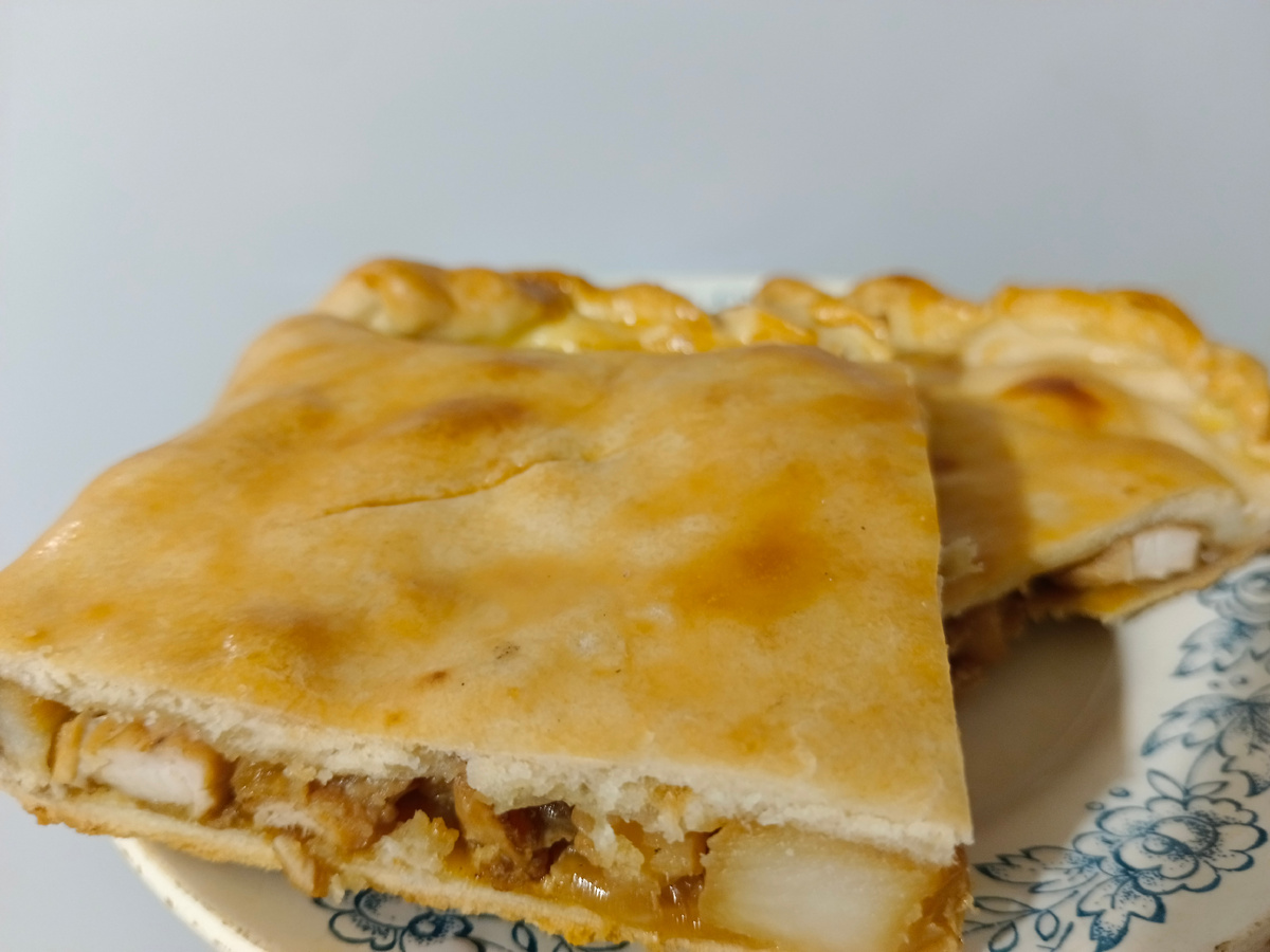 - Начинка: обжаренные куриное филе (150 г), лук (200 г) и картофель (200 г). После остывания к начинке был добавлен белок яйца, а желток послужил для смазывания верха пирога.