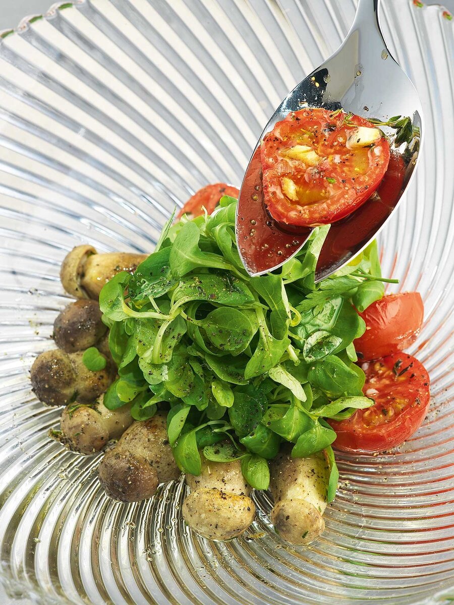 Этот салат — настоящая находка для гурманов, ведь в нем великолепно сочетаются вкус белых грибов с кисло-сладкими нотками бакинских помидоров. Рецепт, предложенный Алексеем Зиминым, акцентирует внимание на том, как немного подсушенные томаты придают блюду дополнительную глубину.