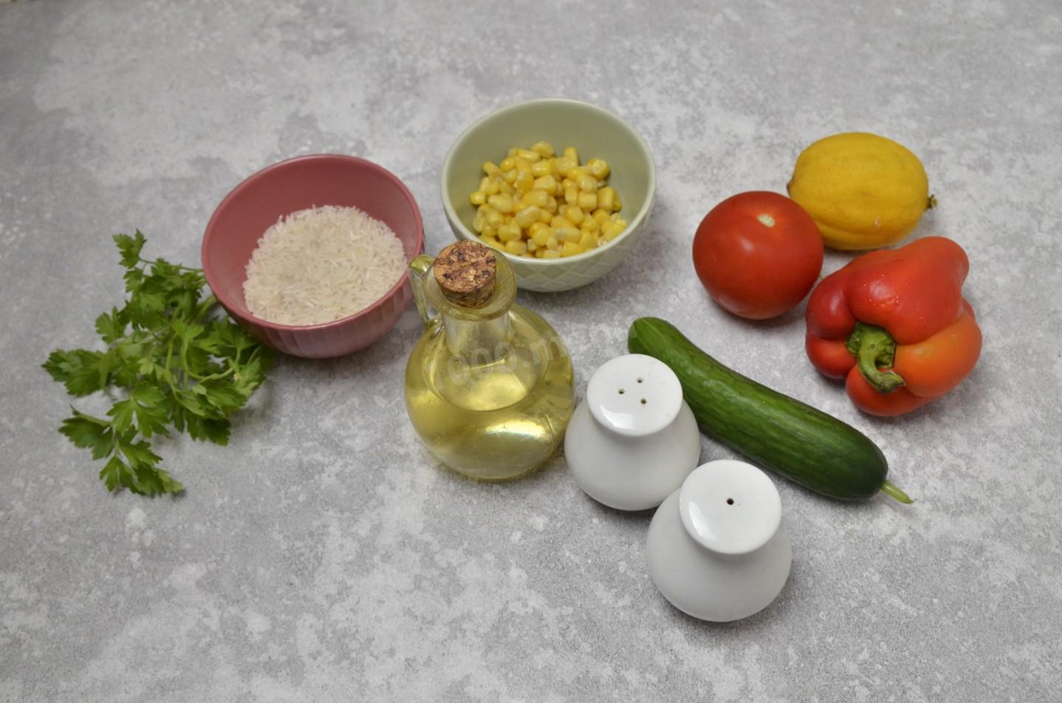 Шаг 5: В большой салатник выложите охлажденный рис, добавьте овощи, зелень и кукурузу. Полейте заранее подготовленной заправкой, приправьте солью и перцем по вкусу.