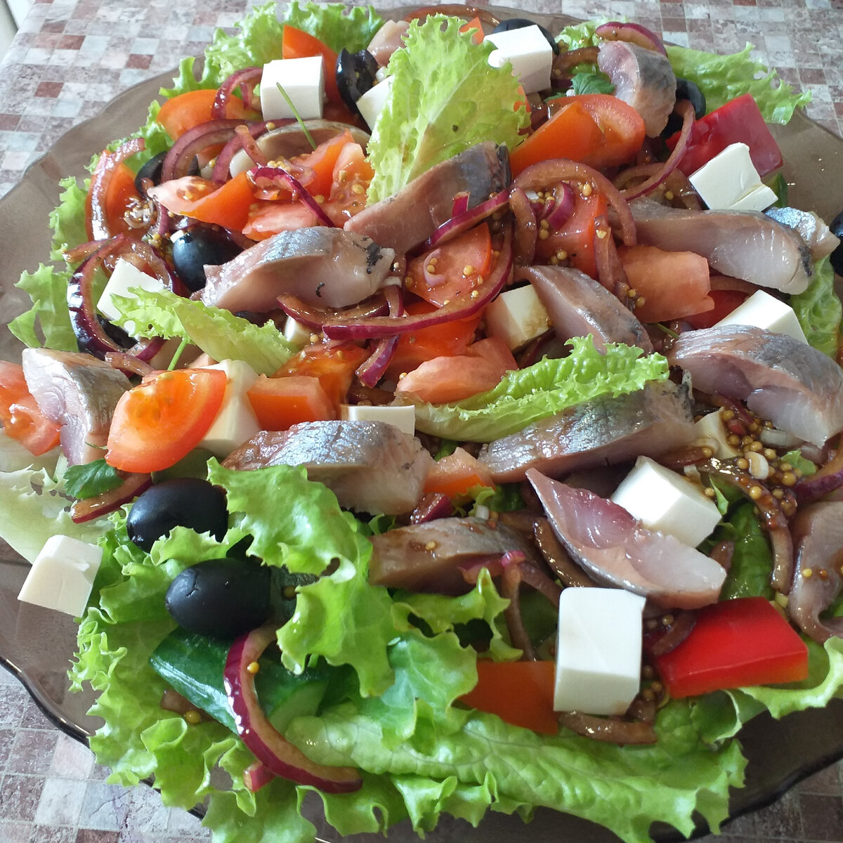 Салат тщательно перемешивается и подается к столу. Греческий салат с сельдью станет отличным выбором как для легкого обеда, так и для праздничного стола. Стоит попробовать этот оригинальный вариант классического блюда, чтобы удивить и порадовать своих близких!