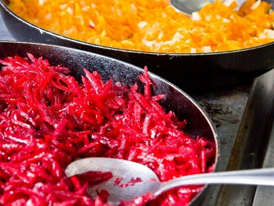 - Подготовка овощей: Начните с очищения и промывания свеклы. Заранее подготавливаем и очищаем морковь. Затем нарежьте все овощи соломкой. Можно добавить мелко нарезанный корень петрушки или сельдерея для усиления вкуса.