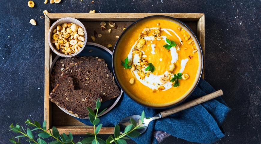 Разогреть духовку до 170 °C и подготовить противень, застелив его бумагой для выпечки.Очистить все овощи: батат и сельдерей нарезать кубиками, морковь – кружочками толщиной 5–6 мм, лук – на 4 части.Выложить нарезанные овощи на противень, посолить и добавить специи. Полить оливковым маслом и тщательно перемешать.Запекать овощи в духовке 20–25 минут, пока они не станут мягкими.Приготовить пряную ореховую смесь. Обжарить фундук на сухой сковороде до появления аромата, затем измельчить его.Подогреть овощной бульон и натереть имбирь на мелкой терке.Переложить запеченные овощи в блендер, добавить бульон и чечевицу. Измельчить до однородной консистенции.Разлить готовый суп по тарелкам, добавить по ложке кокосового молока или сливок, посыпать ореховой смесью и украсить рубленой петрушкой.Этот теплый и сытный суп станет отличным дополнением к любому обеду, даря вам уют в холодные дни.