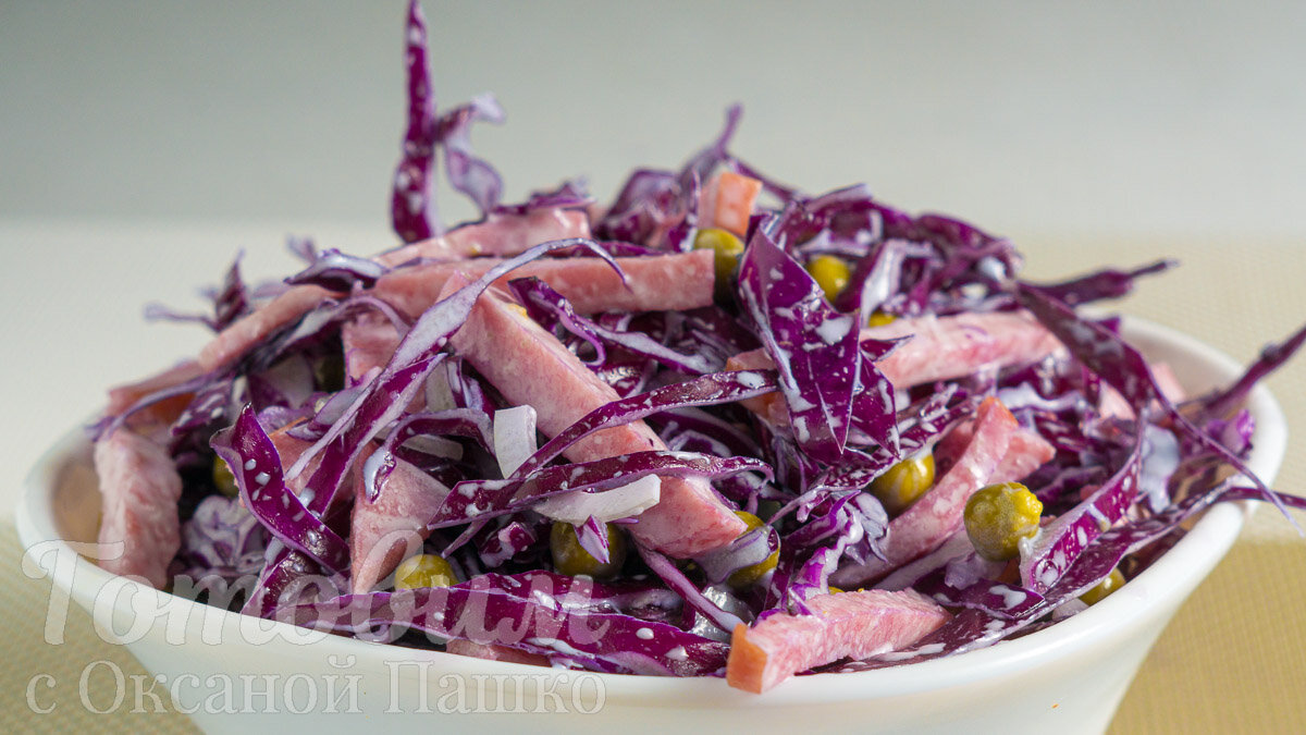 Салат станет прекрасным выбором для семейного ужина, а также разнообразит привычное меню. В его составе использована краснокочанная капуста, однако в качестве основного ингредиента можно использовать любую любимую ветчину или колбасу. Заправить салат можно по желанию: майонезом или нежным йогуртом для салатов.