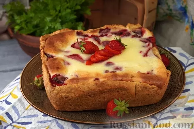 - Песочный пирог с клубникой и сметанной заливкой. Нежное тесто, сочные клубничные дольки и легкая сметанная заливка — идеальное сочетание для душевного чаепития.
