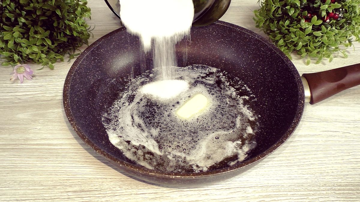 Яблоки следует тщательно вымыть, удалить сердцевину и нарезать средними кусочками, не очищая от кожуры. На предварительно разогретую сковороду добавляется сливочное масло. Важно добавить половину сахара, чтобы яблоки начали выделять сок. Готовить нужно на среднем огне около 7 минут, не накрывая сковороду крышкой. Потихоньку помешивая, стоит следить за тем, чтобы фрукты стали мягкими. Время приготовления может колебаться в зависимости от сорта яблок и их сочности. Если яблоки слишком влажные, лучше удалить избыток влаги, увеличив жар.