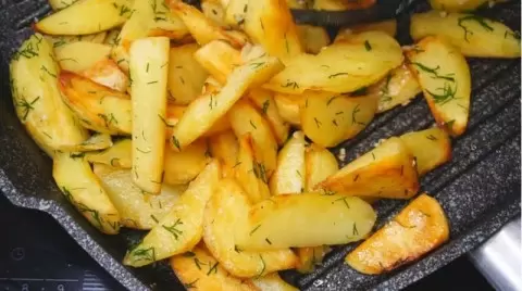Очистите картошку и нарежьте ее на дольки, добавьте специи и обжарьте на сковороде гриль с маслом под крышкой на среднем огне, иногда перемешивая. В конце добавьте до половины нарезанный чеснок и укроп.