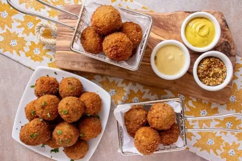 Биттербален — это популярная голландская закуска, которая встречается в барах по всей стране. Эти золотистые и хрустящие фрикадельки, напоминающие крокеты, предлагают восхитительное сочетание текстур и вкусов, идеально подходя к крепким напиткам. Подавайте их с горчицей и бокалом холодного пива или домашнего вина, и вы окажетесь в атмосфере уютного амстердамского кафе.