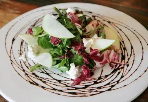 Соберите салат: на листья выложите яблоки, орехи и козий сыр. Обильно полейте заправкой и аккуратно перемешайте. Подавайте блюдо сразу, чтобы сохранить свежесть и яркие вкусы. Прекрасно подходит как самостоятельный легкий перекус или гарнир к основным блюдам.