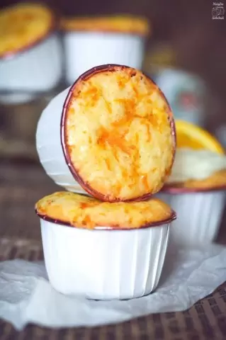 Формы для кексов следует заполнять на половину, а сверху посыпать смесью сахара и апельсиновой цедры. Выпекать в заранее разогретой до 180°C духовке в течение 20 минут. Готовность легко проверить с помощью деревянной палочки: она должна выйти сухой.
