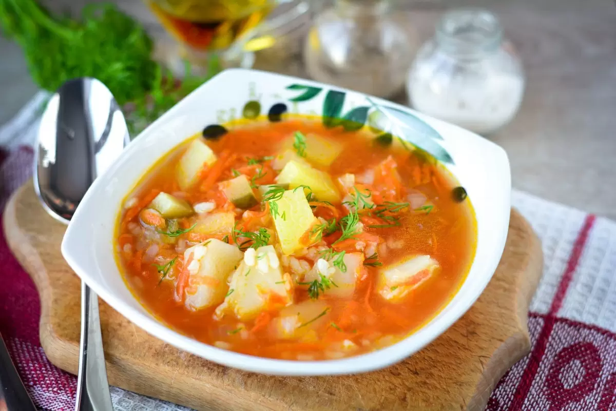 Это блюдо идеально для вторников и четвергов, когда разрешена варёная пища без масла. Рассольник богат на вкус благодаря солёным огурцам и перловке: