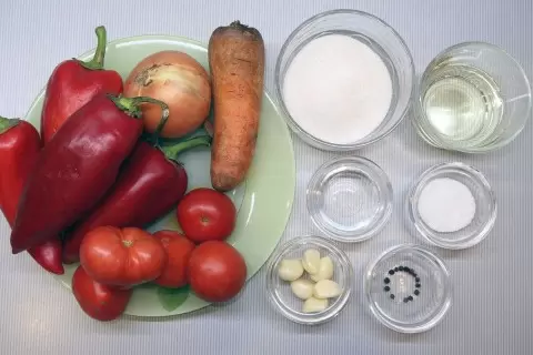 1. Подготовка овощей: выберите спелые помидоры, тщательно промойте их и нарежьте на произвольные куски. Морковь очистите и нарежьте соломкой или натрите на терке для корейской моркови. Болгарский перец разрежьте пополам, удалите семена и нарежьте на тонкие полоски. Лук нарежьте четверть кольцами, а чеснок натрите.