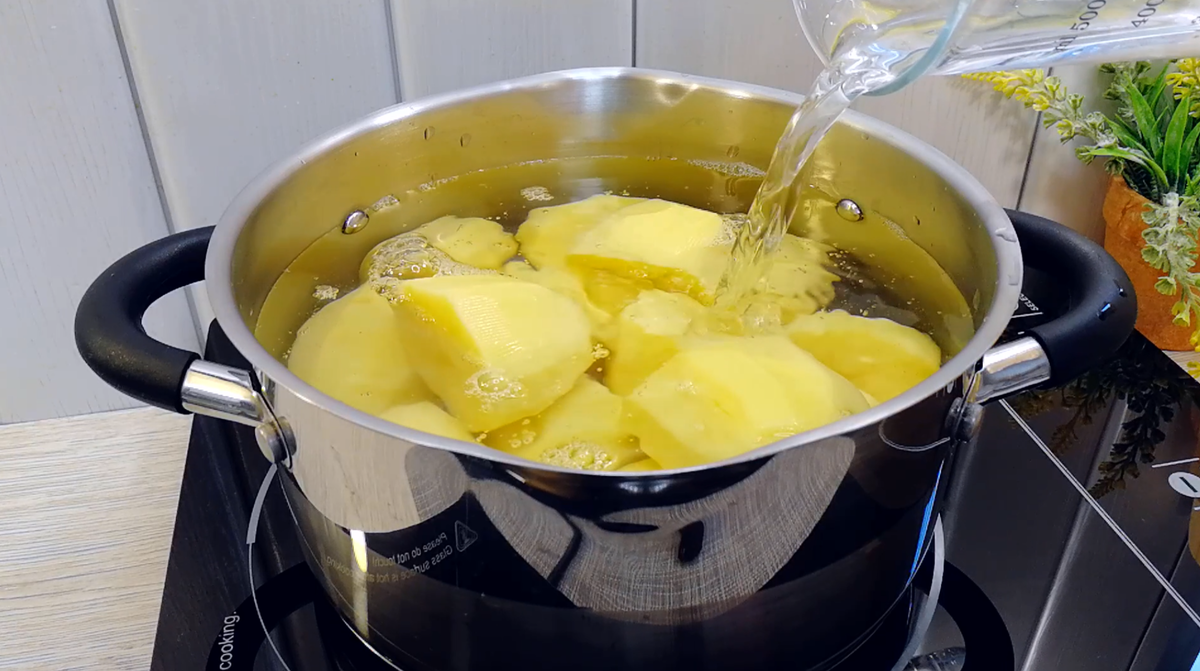Начать стоит с картофеля: его нужно отварить в подсоленной воде до полуготовности, сохранив форму. Когда он приготовится, дайте ему немного остыть и нарежьте кружочками.