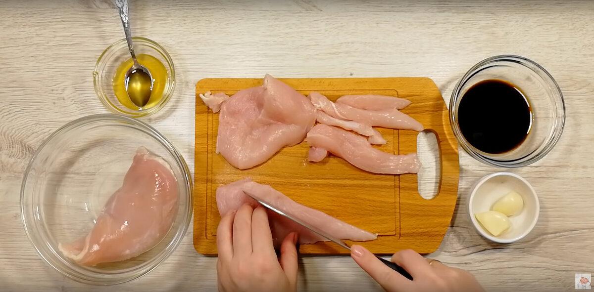 Первый этап — нарезка куриного филе. Оно должно быть нарезано длинными полосками для удобства обжаривания. Далее, в миске потребуется соединить куриную грудку с соевым соусом — достаточно четырех столовых ложек. Секрет насыщенности вкуса кроется в добавлении двух крупных зубчиков чеснока, выдавленных через пресс, и двух чайных ложек меда для легкой сладости.