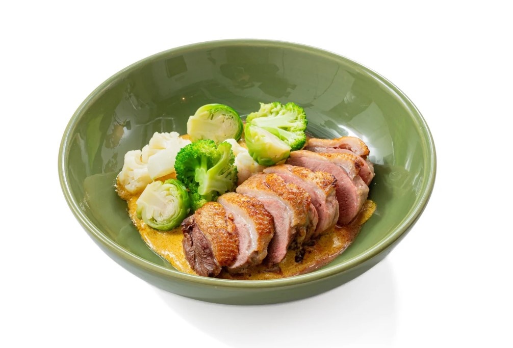 Начать с подготовки всех необходимых ингредиентов. Не забудьте разогреть духовку до 180 градусов.На утиной коже аккуратно сделать надрезы, образуя решетку. При желании утку можно слегка приправить солью и перцем, но следует помнить, что соус будет достаточно соленым.Поместить утиную грудку на холодную сковороду, включить средний огонь и обжаривать до золотистой корочки около 7 минут. Затем перевернуть и обжаривать ещё 2-3 минуты с другой стороны.В отдельном ковше вскипятить подсоленную воду.Брюссельскую капусту разрезать пополам, брокколи и цветную капусту разбить на соцветия размером с половину брюссельской.Обжаренную утку перенести в духовку на 5 минут, чтобы довести до состояния medium.В кипящую воду опустить капусту и варить 2 минуты. После этого быстро охладить под холодной водой, чтобы остановить процесс варки.В сковороду, где жарилась утка, влить ром и выпарить алкоголь в течение 2 минут.Добавить желтую пасту карри, тщательно перемешать до однородной консистенции.Влить сливки, взбить венчиком и готовить до получения густоты, напоминающей нежирную сметану.Подавать утку, нарезанную ломтиками, с ароматным соусом карри и бланшированной капустой на гарнир.Это блюдо станет настоящим украшением вашего стола и подарит незабываемые впечатления всем, кто его попробует. Наслаждайтесь!