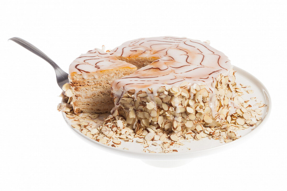 В кастрюле смешать 500 г сахара с 150 мл воды, довести до кипения и варить 3-4 минуты. Затем добавить лимонный сок и довести до температуры 115 градусов. Перелить сироп в другую посуду и оставить остывать до 40-50 градусов.Остывший сироп взбивать деревянной ложкой 15-30 минут, пока он не побелеет и не загустеет. Накрыть пленкой и оставить на 2-3 часа.Белки для коржей лучше «состарить», оставив на ночь под пленкой при комнатной температуре. Взбить их до мягких пиков, затем добавлять сахар и взбивать до жестких пиков.Аккуратно добавить миндальную муку, перемешать и выложить в кондитерский мешок. На пергаменте отсадить коржи эллипсами, посыпать сахаром и выпекать при 170 градусах 25 минут.Для крема довести 250 мл молока до кипения с 75 г сахара и ванильным сахаром, отдельно взбить желтки с оставшимся молоком, мукой и крахмалом. Влить горячее молоко в желтки, возвращаем на огонь и доводим до загустения.Крем остудить и взбить с маслом и миндальной пастой.Собрать торт, чередуя коржи и крем. Верхний корж оставить гладким, обмазать абрикосовым конфитом и обсыпать миндальными лепестками. Оформить кулинарным посыпкой на верхний слой, получая интересный дизайн со шпажкой.