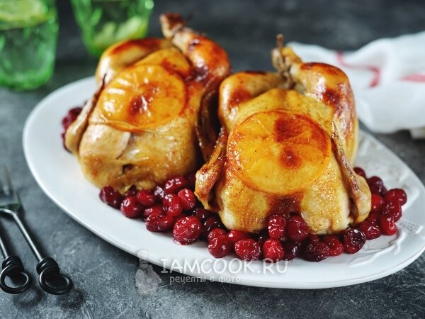 - Цыплята корнишоны с апельсинами и клюквой — запечённые до золотистой корочки;
