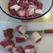 Мясо нарезать кусочками по 40-50 г и отварить до готовности в небольшом количестве воды с добавлением соли. Алычу, курагу и изюм хорошо промыть и обсушить, при необходимости предварительно замочить, чтобы они стали мягче.