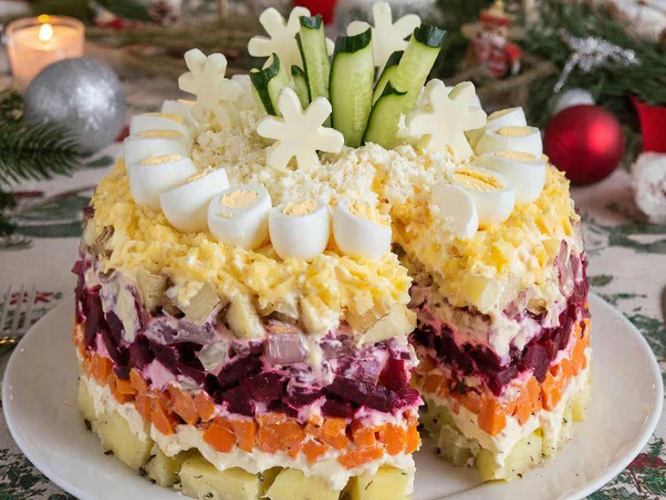 - Четвертый слой: свекла с оставшимся луком, майонез.