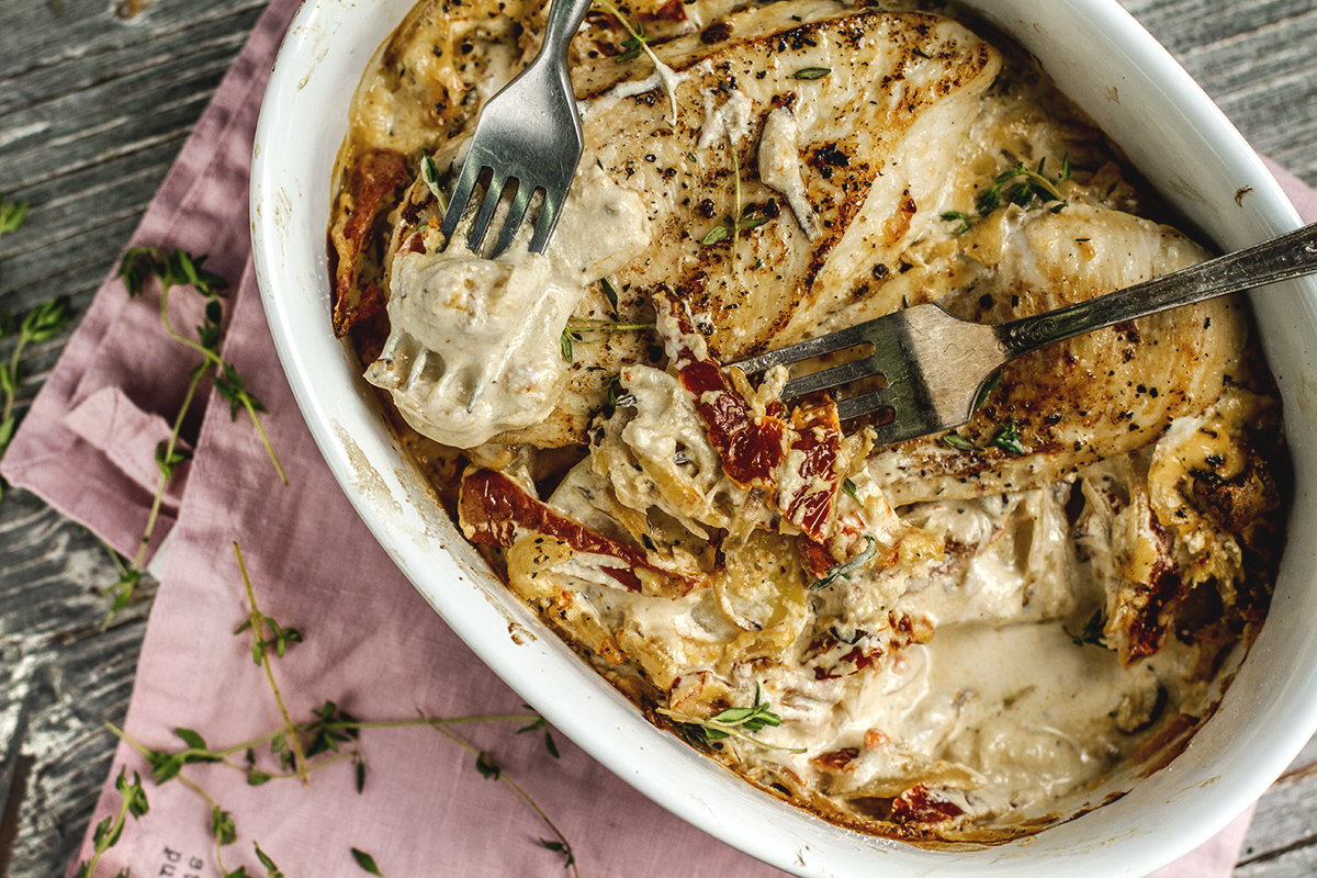 Шаг 4: Залейте куриные грудки приготовленным соусом, равномерно распределите его, и отправьте в духовку запекаться на 30-35 минут. Проверяйте мягкость картофеля, и не забудьте подать горячим!