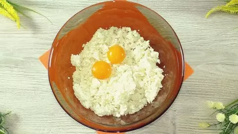 1. В глубокой миске соединить творог, 2 желтка, щепотку соли, ванильный сахар и сметану. Все ингредиенты тщательно перемешать до однородности.