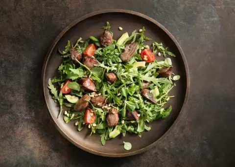Салат с куриной печенью, авокадо и томатами