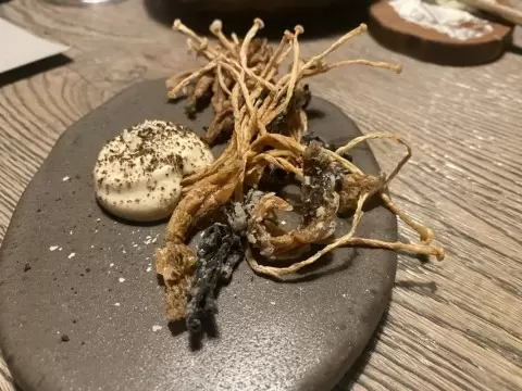 Гастрономическое путешествие начинается в «Лесу», где хрустящие грибы сочетаются с нежным кремом из белых грибов, дополненным ржаной крошкой и жареными дрожжами – это идеальное введение в северный колорит.
