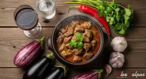 Приготовление начинается с нарезки баранины на кубики, которые не нужно мыть, а лишь слегка промокнуть бумажным полотенцем. Затем мясо обжаривается до появления корочки. Баклажаны нарезают крупно, чтобы устранить горечь, а остальные овощи подготавливаются к сборке. Слои укладываются в глиняный горшок, где каждую порцию посыпают специями — это создаст уникальный аромат.
