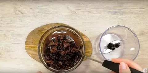Для создания этого удивительного десерта, первым делом необходимо замочить изюм в кипятке на 10 минут, чтобы он стал мягким. Затем следует тщательно измельчить его в блендере до получения однородной массы. Если блендера нет, можно использовать мясорубку.