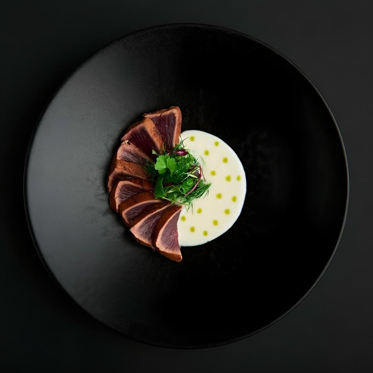При подаче нарезанный тунец выкладывается веером, смазывается цитрусовой заправкой и сервируется на основе миндально-кокосовых сливок. Салат из зелени располагается сверху, а завершающий штрих — брызги масла из кинзы и лайма, приправленные ситими.